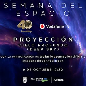 Con motivo de la Semana Mundial del Espacio y del 40º aniversario de Discovery Channel les invitamos a ver la proyección fulldome «Cielo Profundo» y a participar del acto de celebración de su aniversario, en el que intervendrán las divulgadoras científicas La Gata de Shrödinger Diario de una científica.